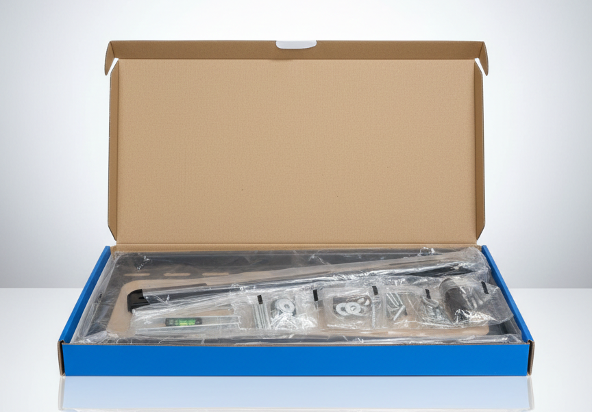 - طقم تركيب متكامل: يأتي داخل العلبة طقم كامل من المسامير، الفيشر، والورد المعدنية منظمة في أكياس لتسهيل عملية التركيب السريع (Easy Installation).