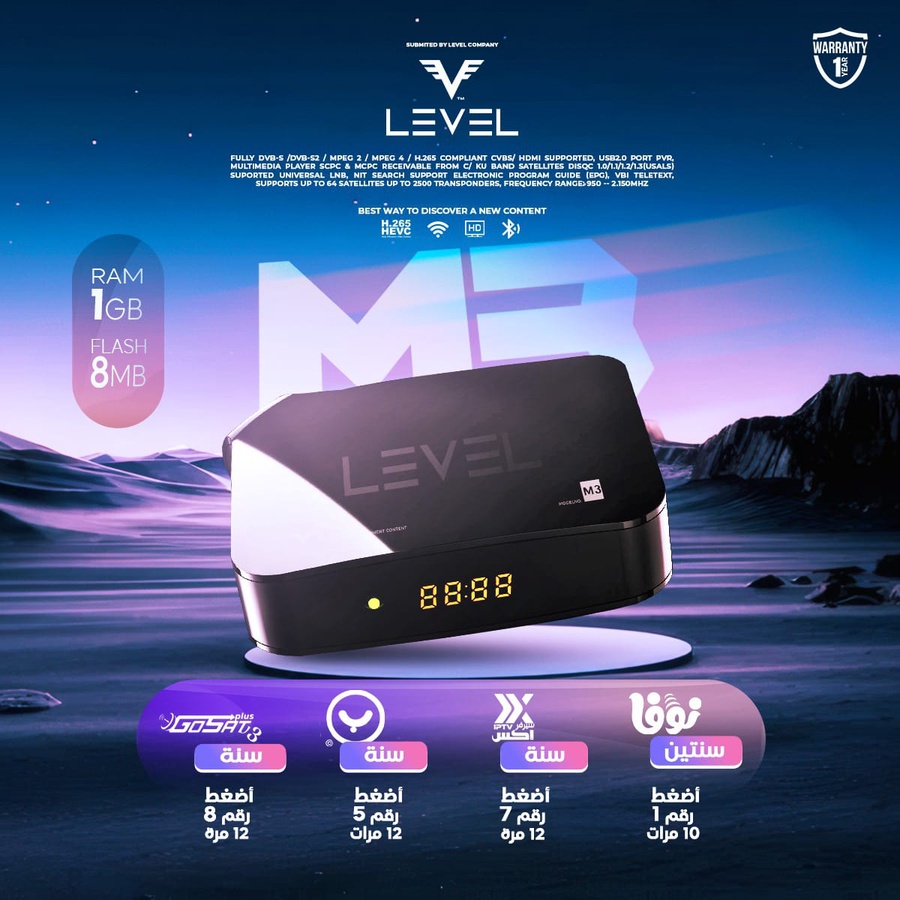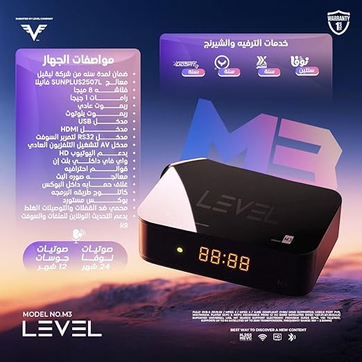 يُعد جهاز Level M3 مزيجاً فريداً بين الشكل العصري الجذاب والسرعة الفائقة في التشغيل. إذا كنت تبحث عن جهاز يدعم أحدث تقنيات البث وبجودة صورة احترافية، فإن M3 هو اختيارك الذكي.