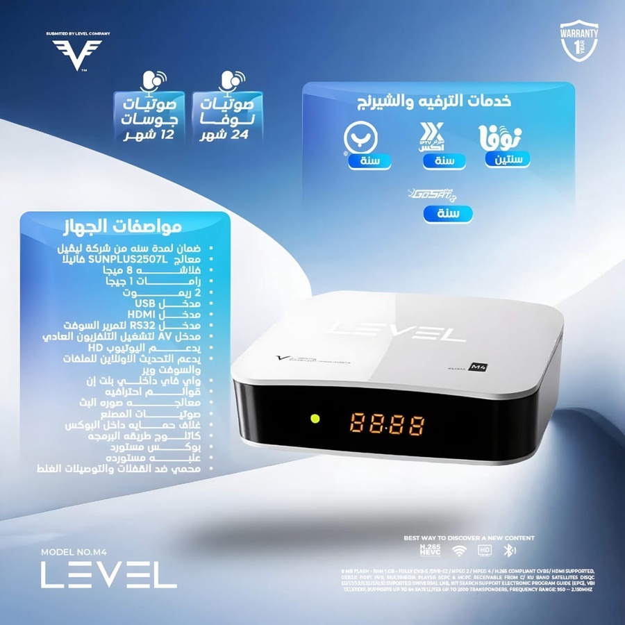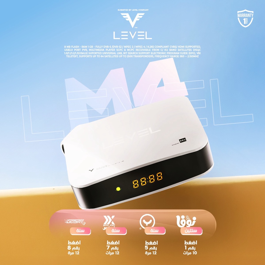 يأتي جهاز Level M4 ليكون الواجهة المثالية لمحبي الترفيه المنزلي، حيث يجمع بين التصميم العصري الأنيق والعتاد الداخلي القوي الذي يضمن لك سلاسة تامة في التشغيل وجودة صورة Full HD خلابة.