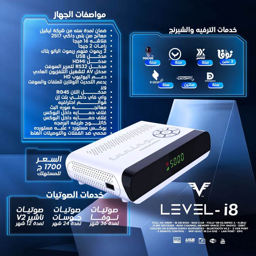 إذا كنت تبحث عن التميز التقني والاستقرار التام، فإن LEVEL i8 هو خيارك الأول. يجمع الجهاز بين معالج صن بلس القوي ورامات ضخمة لتقديم تجربة مشاهدة فائقة الجودة بدقة Full HD 1080P مع دعم كامل لتقنية H.265 لتوفير أفضل جودة صورة بأقل استهلاك للإنترنت.