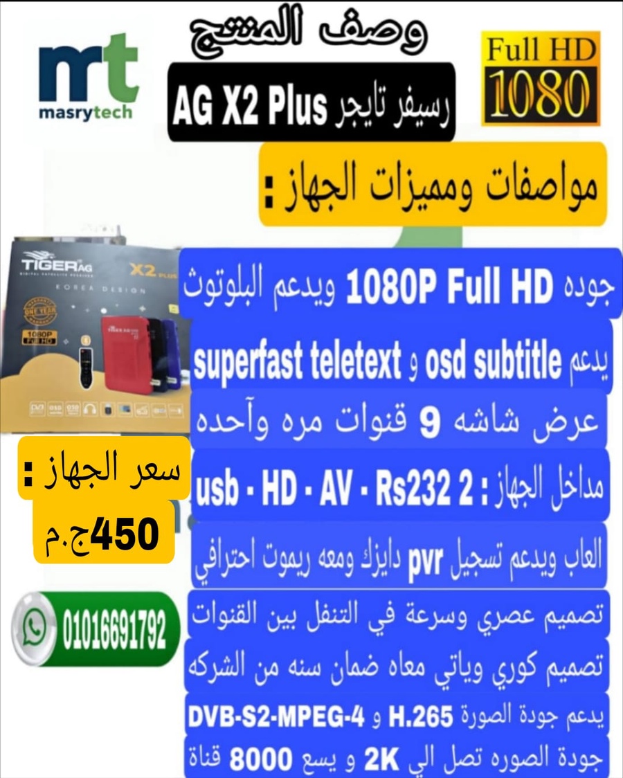 من MasryTech، بنقدم لك الحل الأمثل لمشاهدة ممتعة وبدون تعقيدات. جهاز TIGER AG X2 Plus مش مجرد رسيفر، ده جهاز مصمم بتكنولوجيا كورية عشان يديك أداء ثابت وسرعة خيالية في التنقل بين القنوات.