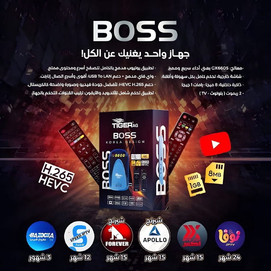 جهاز Tiger AG BOSS مش مجرد رسيفر، ده مركز ترفيهي متكامل بتكنولوجيا كورية متطورة، مصمم خصيصاً للمستخدم اللي بيقدر "الاستقرار" والجودة العالية في الصورة والتحكم