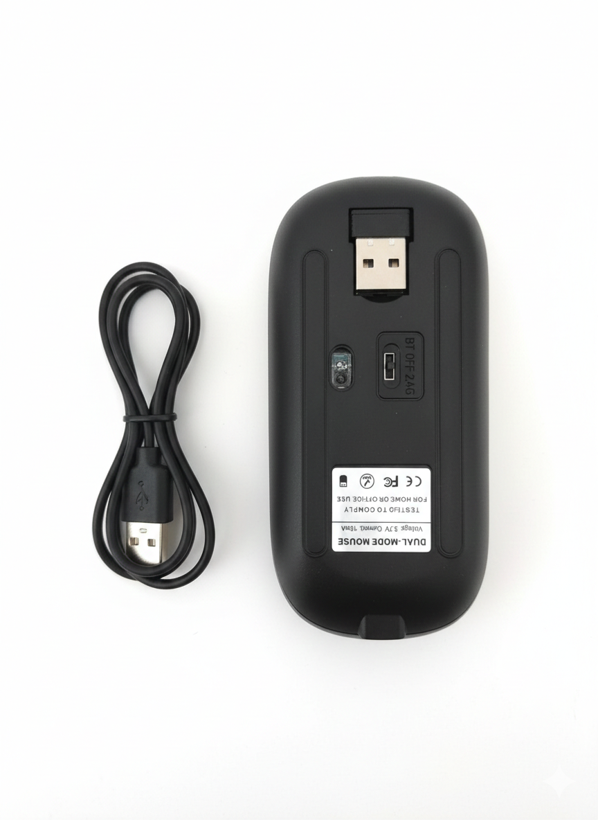 🔗 ثنائي نظام الاتصال (Dual Mode): يدعم التوصيل عن طريق Bluetooth أو عن طريق فلاشة الـ 2.4G Wireless؛ يعني تقدر توصله باللابتوب، التابلت، أو حتى الموبايل والشاشة الذكية بكل سهولة.