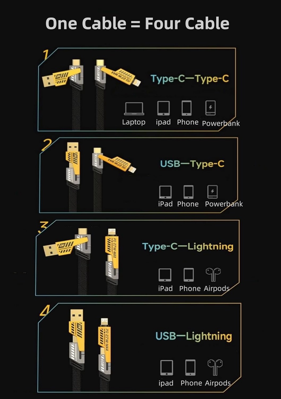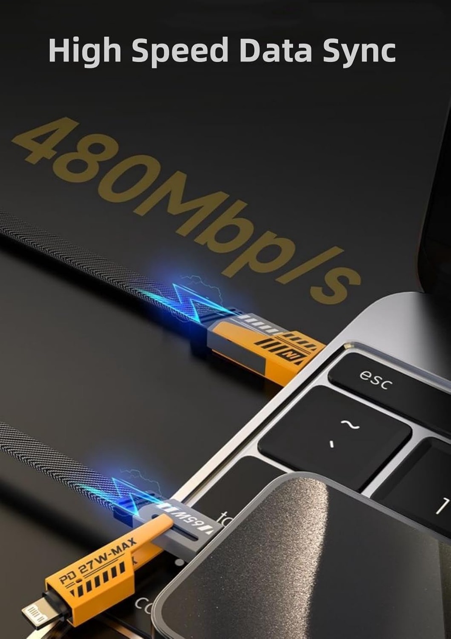 - 4-in-1 Master Design: الطرف الأول (USB-A و Type-C) والطرف الثاني (Type-C و Lightning). يعني تقدر توصل أي شاحن بأي جهاز (أيفون، سامسونج، لابتوب، سماعات) بدون تفكير.